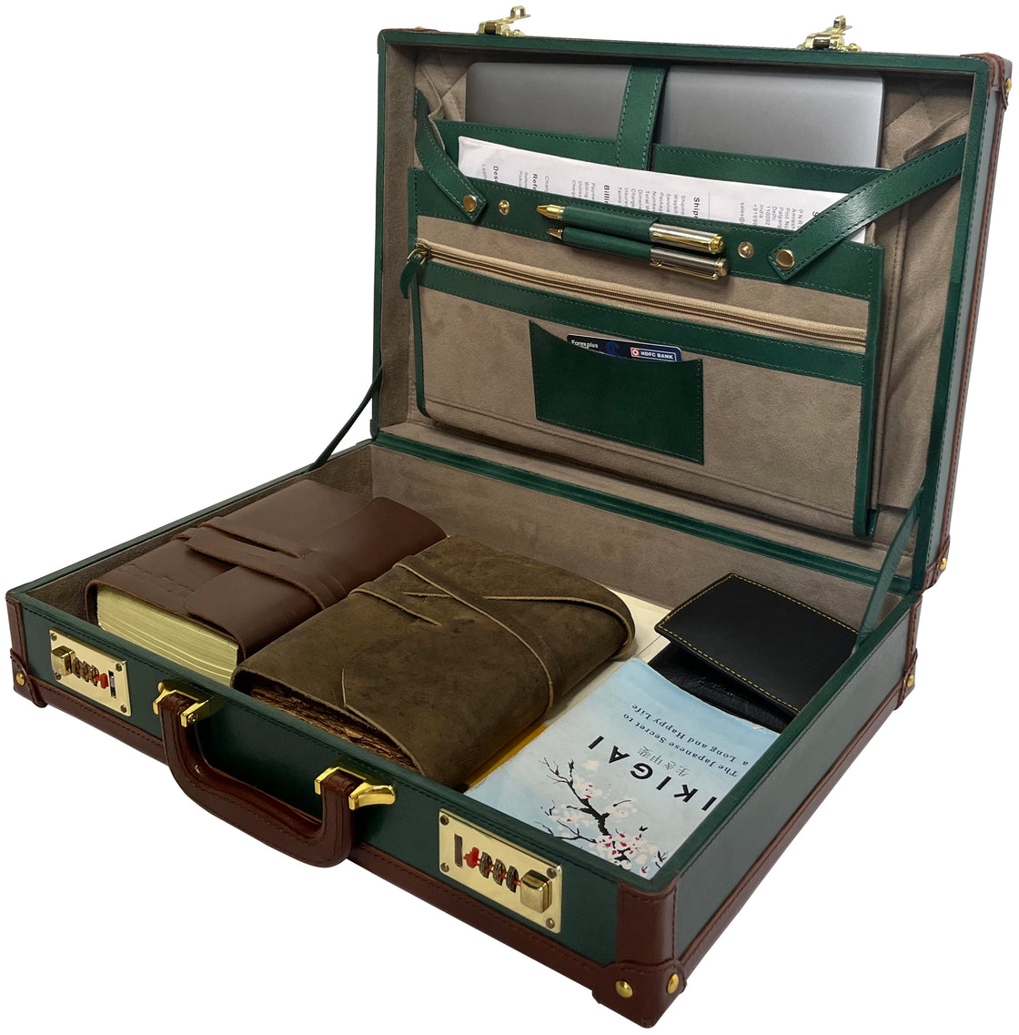 UNMATCHED QUALITY: Our briefcase is meticulously crafted from the finest Full-Grain leather, ensuring durability, a luxurious feel, and a timeless appeal that only improves with age. Make a lasting impression with a statement piece that exudes elegance.
