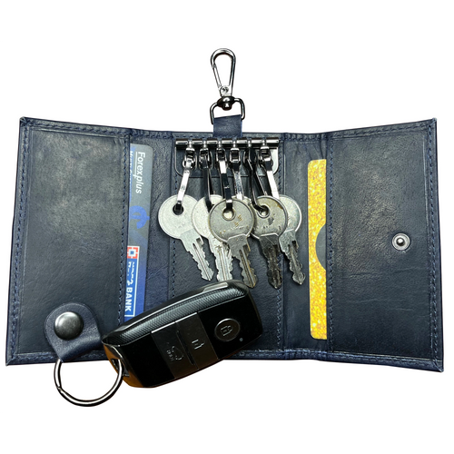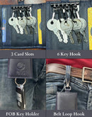 Experience the perfect blend of style and functionality with our portable key holder. Its dimensions – Length: 2.8", Width: 0.7", Height: 4.2" inches – strike the ideal balance between a compact form and spacious capacity. Accommodate up to 6 keys effortlessly, complete with a robust keyring. What's more, discover the convenience of a removable key loop that doubles as a FOB or a dedicated car key loop. The practicality continues with 3 credit card slots, securely sealed with snap closures, ensuring your keys and cards stay firmly in place.
